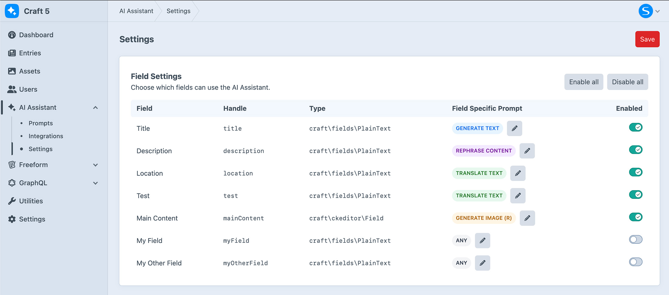 Enable AI Assistant on the fields you want and set a default provider and model for each.