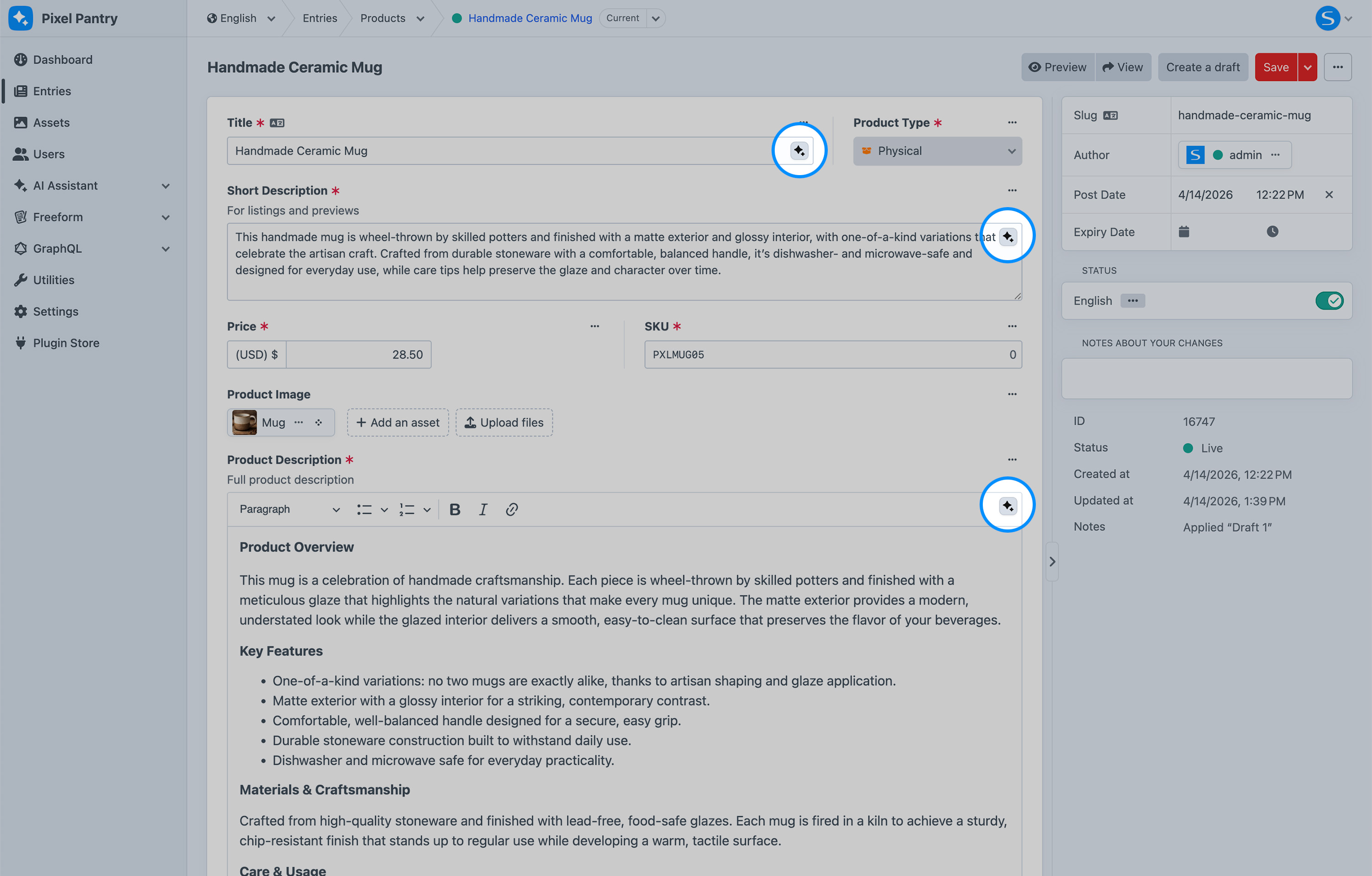 - Work seamlessly inside the Craft control panel with AI tools built directly into your editing experience.